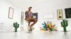 A smiling man sitting on a white stool in an art gallery with colorful geometric art, cactus cutouts, and a neon sign that says 'You Are Amazing' on white walls. View fullsize