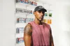 A man stands in a greenhouse with shelves of green seedlings around him, wearing a blue t-shirt with the word 'essential' and a cap.