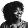 Black and white portrait of a woman with curly hair and tribal face paint, wearing large earrings and a patterned top.